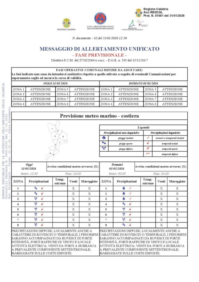 Criticità meteo marino – costiera: precipitazioni diffuse, localmente anche a carattere di rovescio o temporale; i fenomeni saranno accompagnati da rovesci di forte intensità, forti raffiche di vento e locale attività elettrica; venti da forti a burrasca a prevalente componente settentrionale; mareggiate sulle coste esposte.