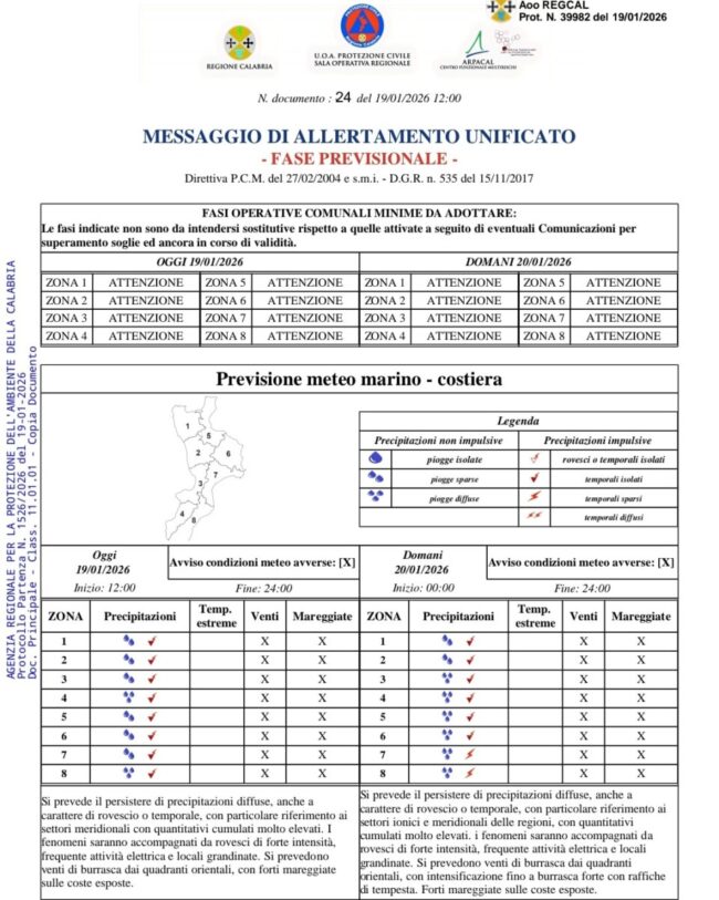 Per la giornata di oggi 19 gennaio diramata Allerta Arancione su Cala 4, 6, 7 e 8, Gialla sul resto della Regione.