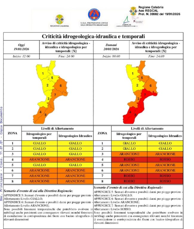 Per domani 20 gennaio Allerta Rossa su Cala 4, 6, 7 e 8. Allerta Arancione su Cala 3 e 5. Gialla su Cala 1 e 2.