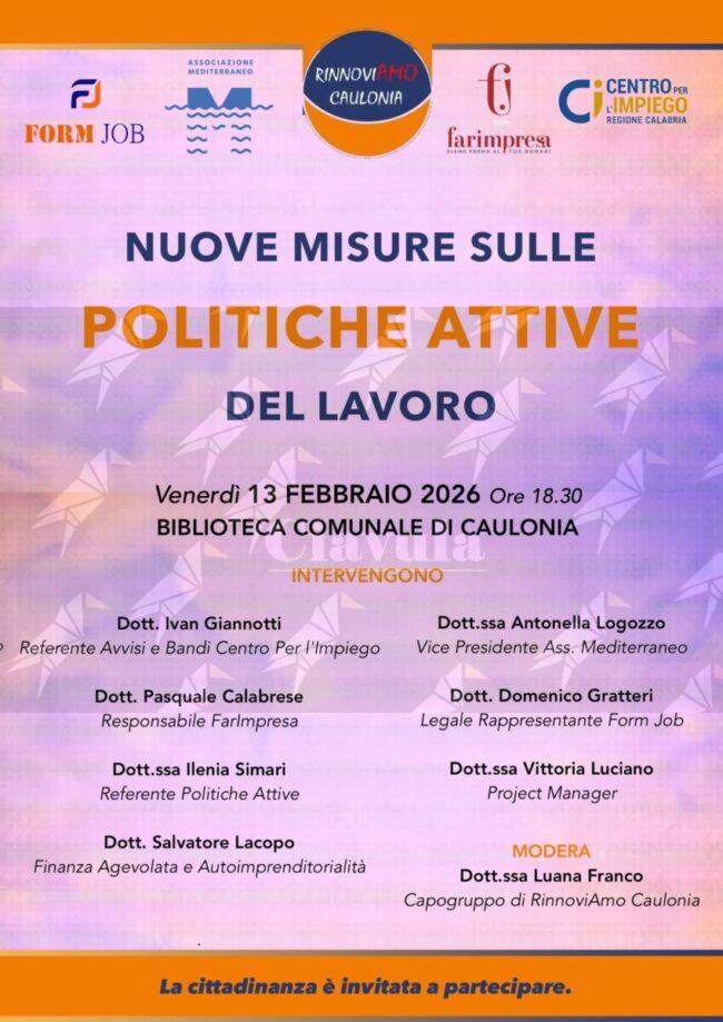 Il gruppo politico RinnoviAmo Caulonia promuove un convegno pubblico dedicato alle nuove misure sulle Politiche Attive del Lavoro, con l’obiettivo di offrire informazioni concrete e aggiornate sulle opportunità occupazionali, sugli incentivi e sugli strumenti di sostegno oggi disponibili.