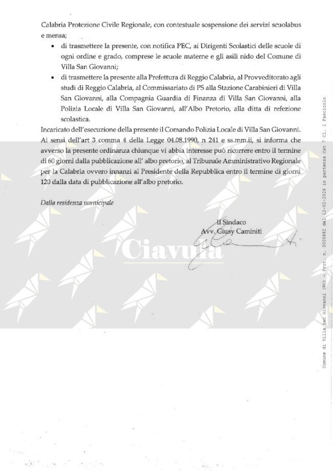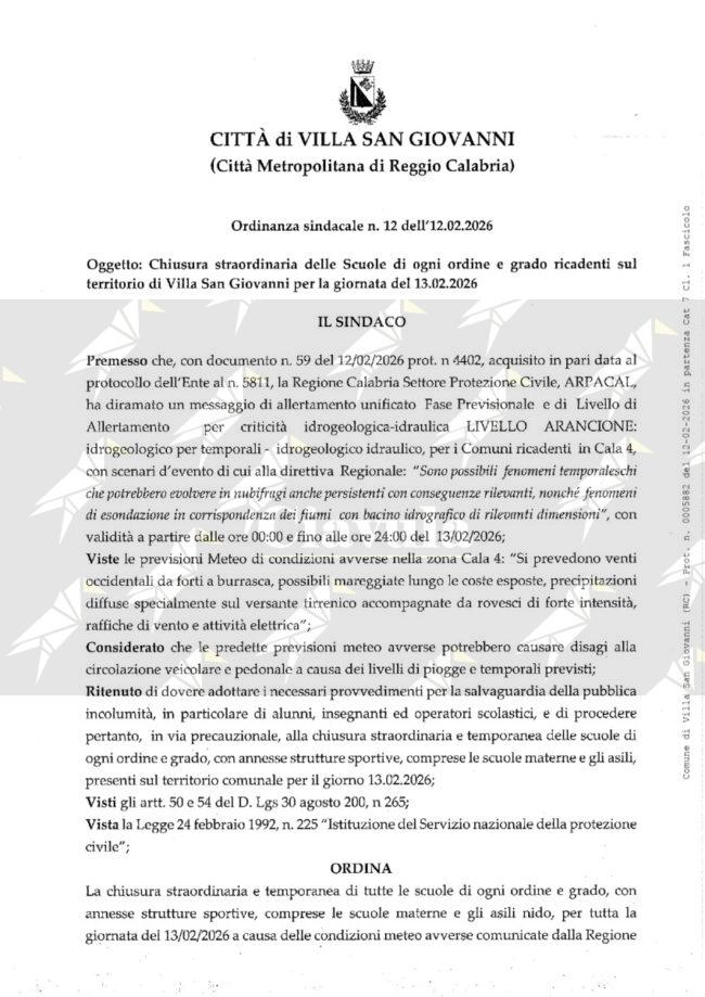 Pubblichiamo l’ordinanza sindacla N°12 del 12/02/2026 del comune di Villa San Giovanni.