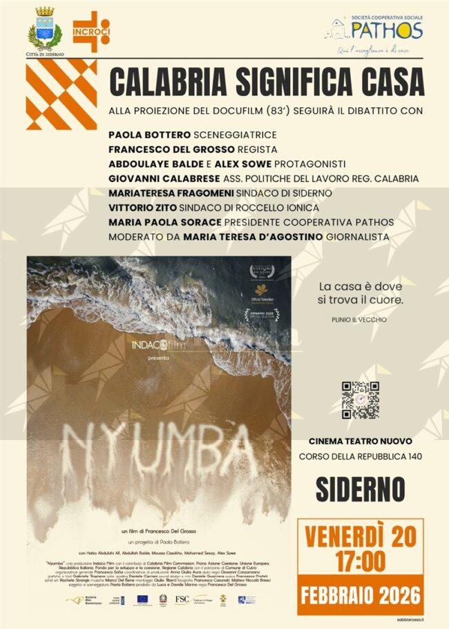 Venerdì 20 febbraio 2026, ore 17, al Cinema Teatro Nuovo di Siderno arriva, con ingresso gratuito, la terza tappa dell’evento CALABRIA SIGNIFICA CASA. Un percorso di memoria, dedicato ai 94 migranti che il 26 febbraio 2023 persero la vita a Steccato di Cutro e alle oltre 30mila vittime dei viaggi della speranza, che giacciono nel cimitero Mediterraneo. Un percorso necessario per ricordare chi siamo e per costruire nuovi cammini in una terra accogliente come la Calabria.