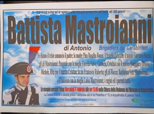 Domani mercoledì 4 febbraio alle ore 15:00 presso la chiesa della Madonna del Miracolo ad Acquafredda di Lamezia Terme si terranno i funerali del brigadiere dei carabinieri Battista Mastroianni.
