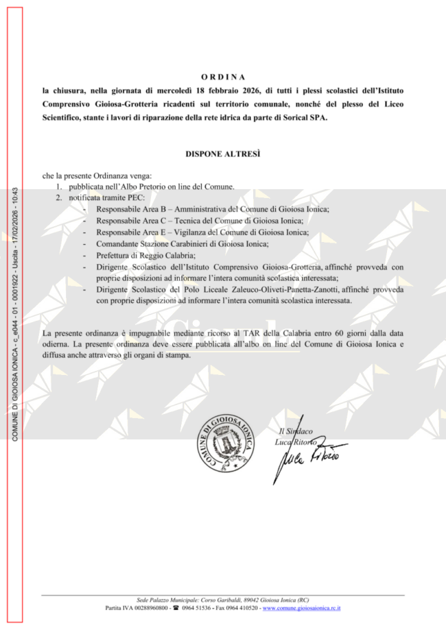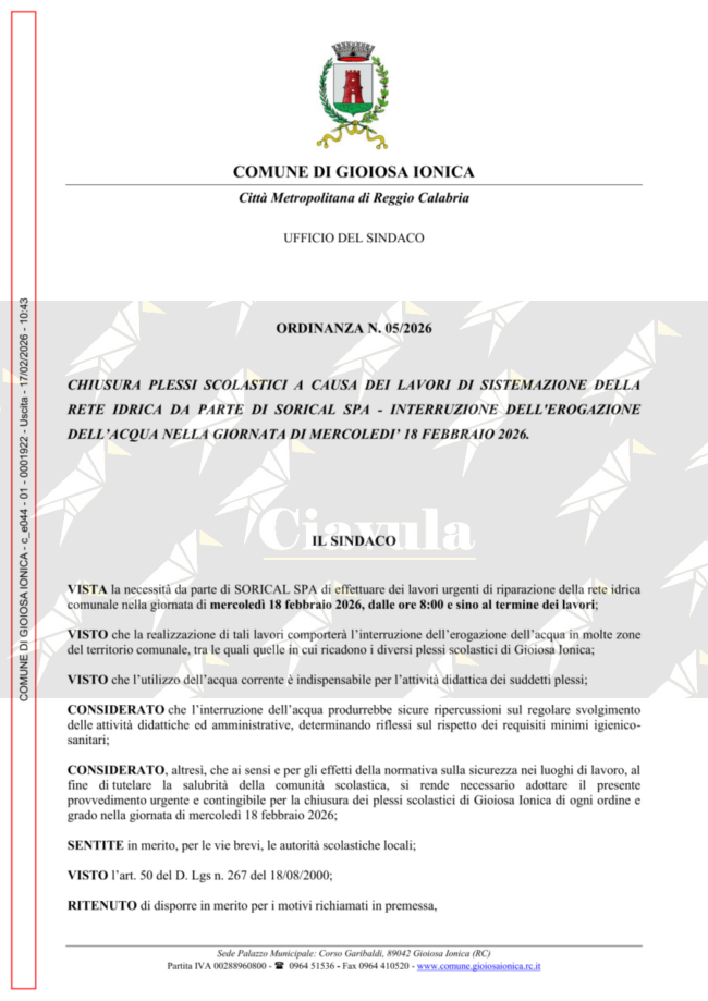 Con ordinanza sindacale, il Comune di Gioiosa Ionica dispone la chiusura di tutti i plessi scolastici per mercoledì 18 febbraio 2026 a causa dei lavori urgenti alla rete idrica da parte di Sorical, che comporteranno la sospensione dell’acqua.