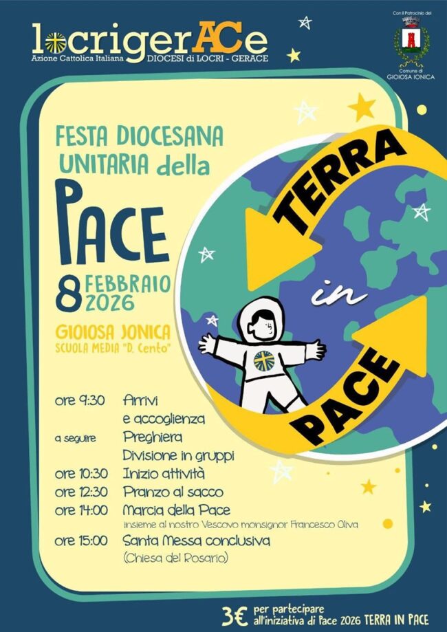 Domani, domenica 8 febbraio 2026, Gioiosa Ionica ospiterà la Festa diocesana unitaria della pace – “Terra in Pace”, una giornata di incontro e riflessione che coinvolgerà la comunità nel corso dell’intera giornata, con momenti di animazione per i più piccoli, la Marcia della Pace e la celebrazione eucaristica.