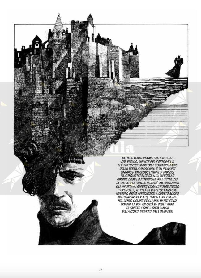 In “Algarve 1460”, Toppi segue l’ossessione dell’infante Enrico, un uomo che sacrifica onori militari e ricchezze nel tentativo di decifrare cosa si nasconda oltre l’orizzonte. La ricerca del principe portoghese si trasforma in una metafora sulla sete di conoscenza che consuma l’essere umano, sospesa in una dimensione dove il confine tra sogno e realtà appare sempre più labile.