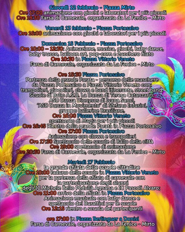 Si comincia, ovviamente, giovedì 12 col Carnevale in piazza Mirto. Dalle 17 animazione, giochi e laboratori per i più piccoli, mentre dalle 18:30 le risate saranno assicurate dalla farsa organizzata dall’associazione “La Fenice”.
