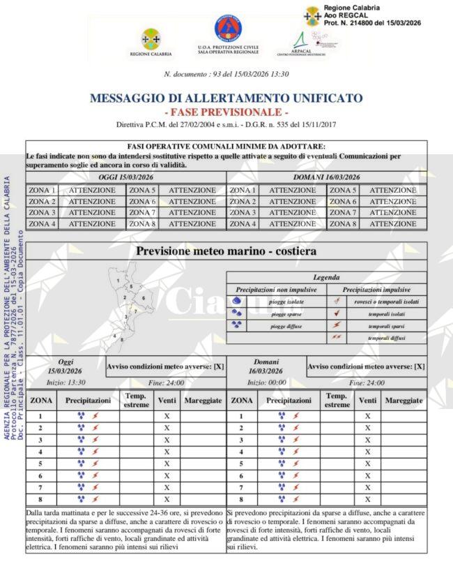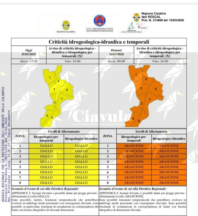 Diramata Allerta Arancione su tutta la Regione per domani 16 marzo 2026.