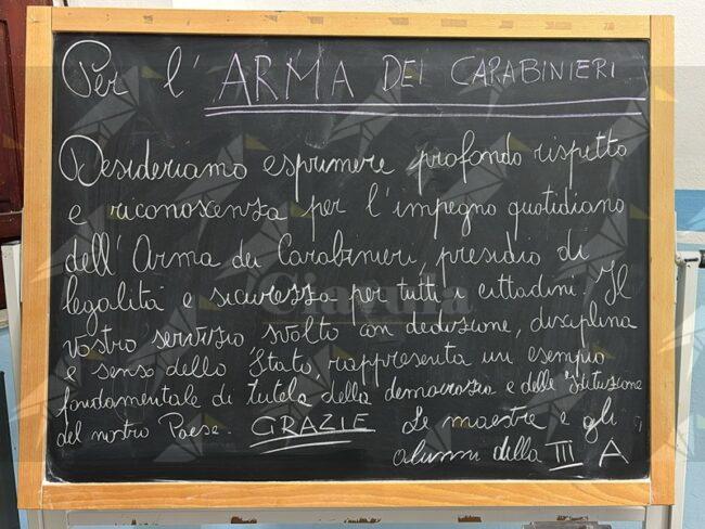 Sulla lavagna della loro classe, i ragazzi hanno scritto parole di sincero apprezzamento per l’impegno quotidiano dei Carabinieri, evidenziandone il ruolo fondamentale a tutela della legalità e della sicurezza della collettività.