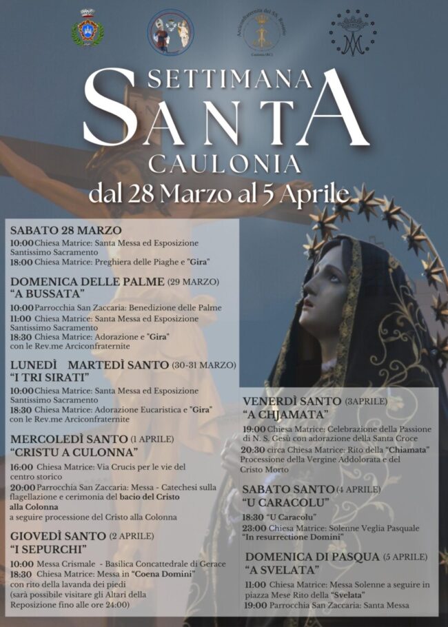 HomeCalabriaIl programma della “Settimana Santa” a Caulonia A Ciavula28 Marzo 2026 10:16 0 Gli antichi riti tramandati nel tempo, un viaggio suggestivo tra fede popolare e spiritualità con celebrazioni solenni e processioni che raccontano la Passione di Cristo. Comune di Caulonia CATEGORIES CalabriacauloniaNewsTutte le notizie TAGS cauloniacomune di cauloniasettmana santa Share ThisAUTHORA CiavulaRedazione