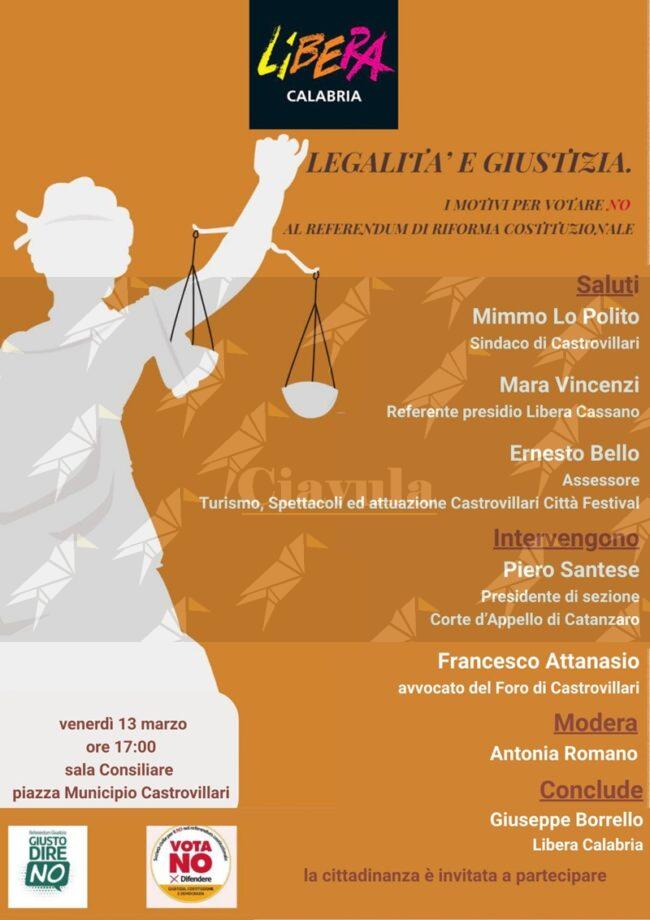 Si svolgerà domani, venerdì 13 marzo alle ore 17.00, presso la Sala Consiliare del Comune di Castrovillari, un’iniziativa pubblica promossa da Libera per il “NO” al referendum costituzionale, nata per informare i cittadini e approfondire i contenuti della riforma e le ragioni della contrarietà espresse da numerose realtà istituzionali e associative.