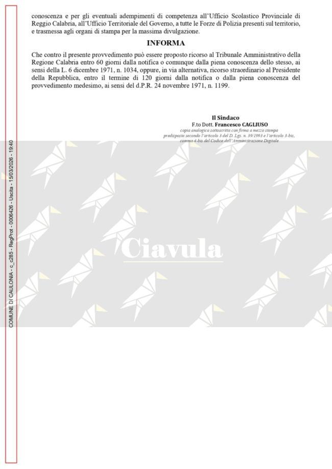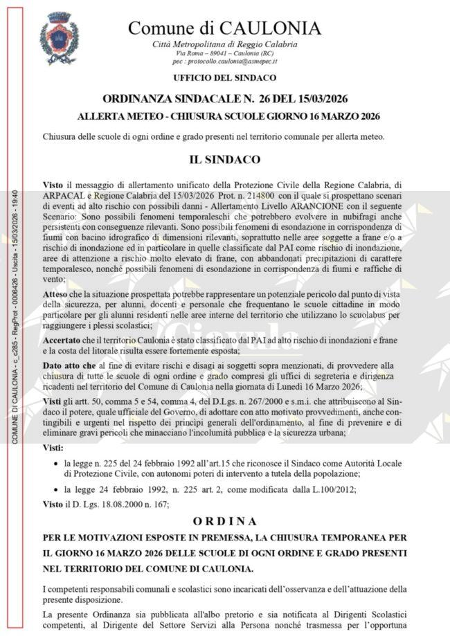 Pubblichiamo l’ordinanza n. 26 del 15/03/2026 del comune di Caulonia.