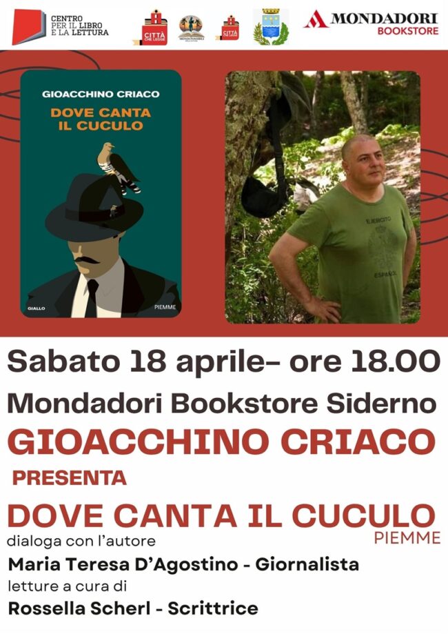 Nell’ambito del progetto “Siderno. I mondi possibili della lettura” finanziato dopo che la Città di Siderno ha ottenuto, per il secondo triennio consecutivo, il titolo di “Città che legge” del Cepell, sabato 18 aprile alle 18 al bookstore Mondadori del centro commerciale “La Gru”, avrà luogo la prima presentazione, su scala nazionale, di “Dove canta il cuculo”, il nuovo romanzo di Gioacchino Criaco, appena uscito per Piemme.