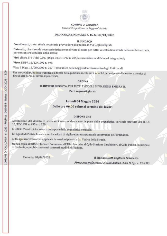 L’Amministrazione Comunale di Caulonia comunica che, con Ordinanza Sindacale n. 45 del 30