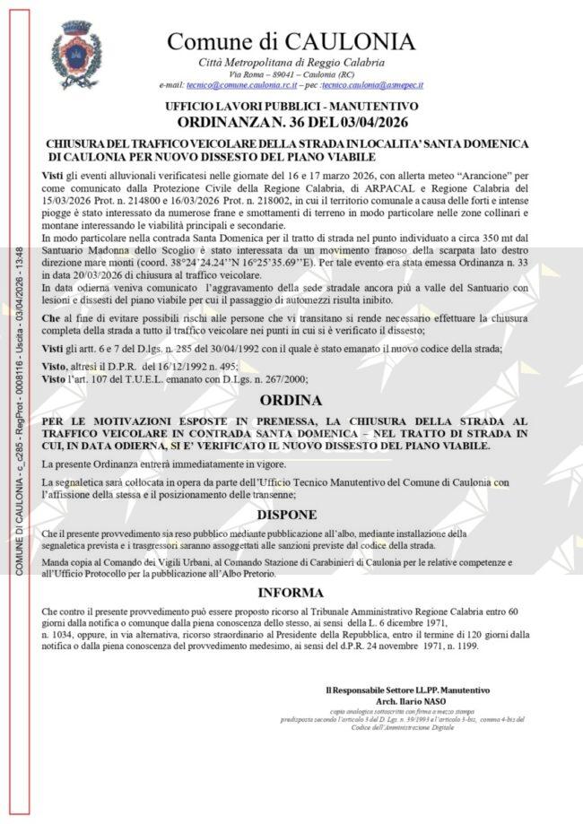 In seguito al cedimento del manto stradale tra Caulonia e Santa Domenica di Placanica il comune di Caulonia ha provveduto ad emanare un’ordinanza per la chiusura della strada.