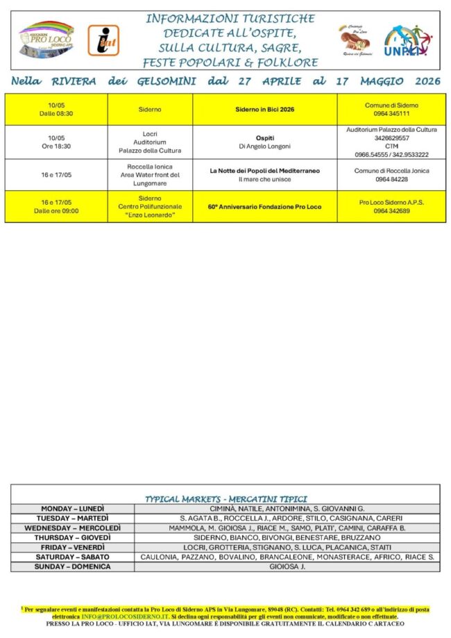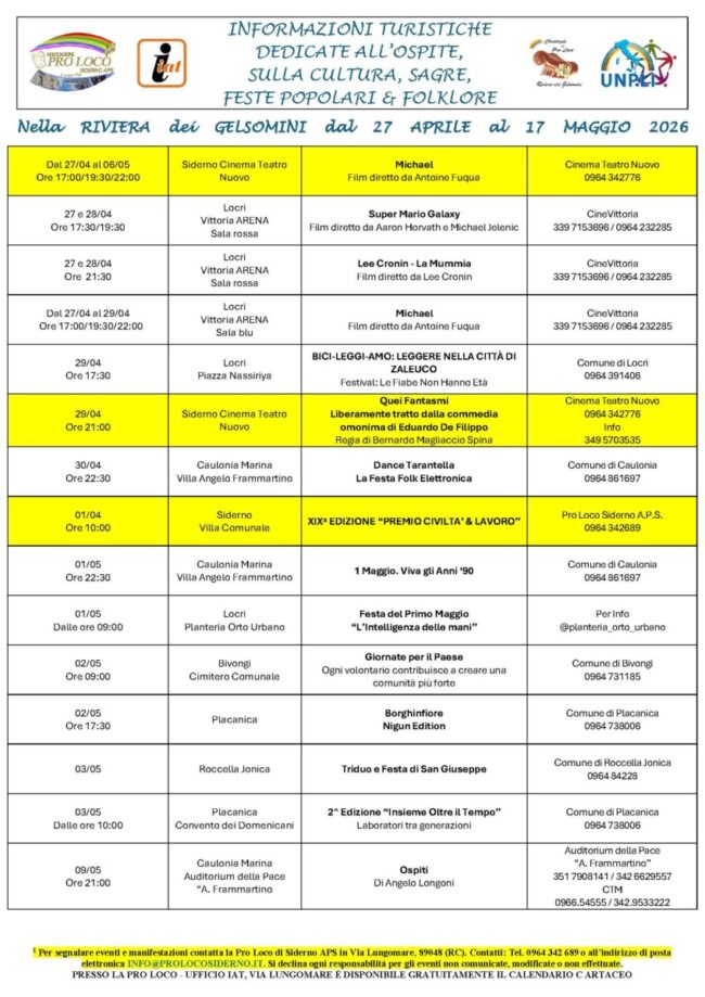 HomeCalabriaIl calendario degli eventi culturali della Locride dal 27 aprile al 17 maggio A Ciavula27 Aprile 2026 18:34 0 Condividiamo di seguito l’elenco degli eventi culturali della Locride che si terranno dal 27 aprile al 17 maggio 2026. Segreteria Pro Loco Siderno A.P.S. CATEGORIES Calabriacultura e societàDalla LocrideNewsTutte le notizie Share ThisAUTHORA CiavulaRedazione