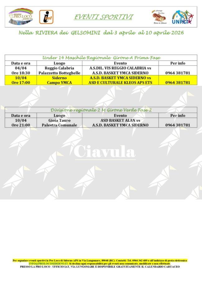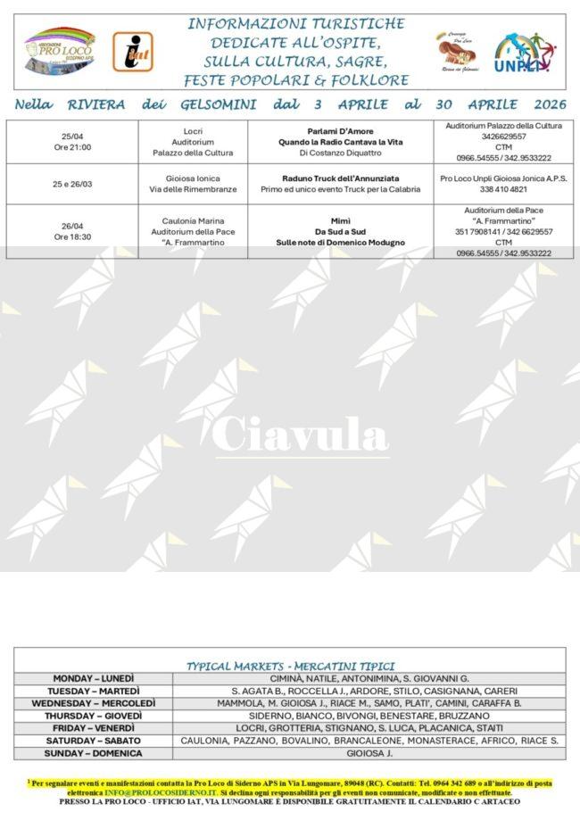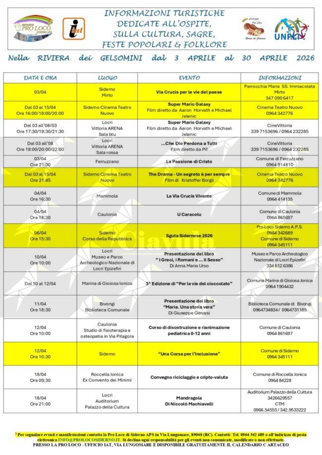 Condividiamo di seguito l’elenco degli eventi culturali e sportivi della Locride che si terranno dal 3 al 26 aprile 2026.