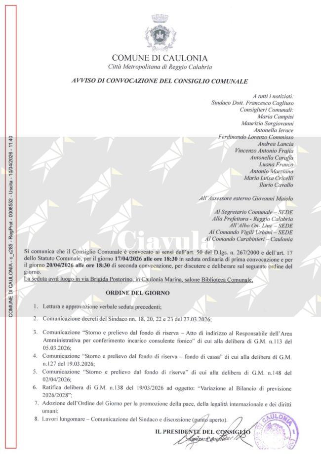 Il Consiglio Comunale di Caulonia è stato convocato per il giorno 17 aprile 2026 alle ore 18:30, in prima convocazione, presso il salone della Biblioteca Comunale di Caulonia Marina, in via Brigida Postorino. La seduta affronterà diversi punti, tra cui un ordine del giorno sulla pace, la legalità internazionale e i diritti umani.