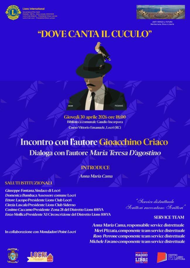 Nell’ambito del service distrettuale “Scrittori raccontano Scrittori”, i Lions Club di Locri e Siderno, con il patrocinio dell’Assessorato alla Cultura per “Locri Città che legge – Il Maggio dei libri”, promuovono la presentazione del romanzo “Dove canta il cuculo” di Gioacchino Criaco (Piemme), in programma giovedì 30 aprile alle ore 18.00, nella Biblioteca comunale “Gaudio Incorpora” di Palazzo Nieddu, a Locri.