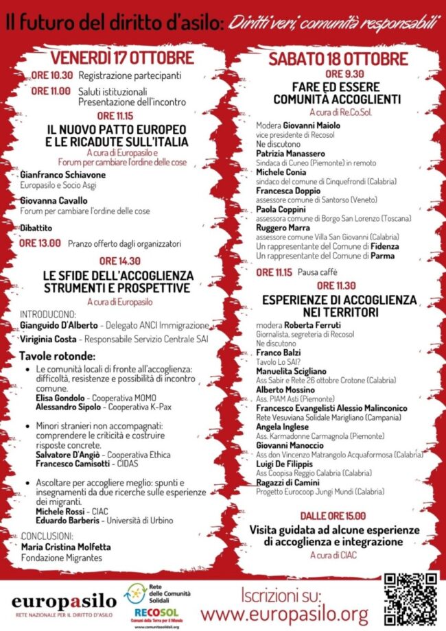 Il 17 e il 18 ottobre a Parma si è tenuta la conferenza nazionale sul futuro del diritto di asilo organizzata da Re.co.sol. ed Europasilo. Una folta delegazione della Calabria ha presenziato ed è intervenuta per raccontare le proprie esperienze. Pubblichiamo il video con gli interventi degli ospiti calabresi.
